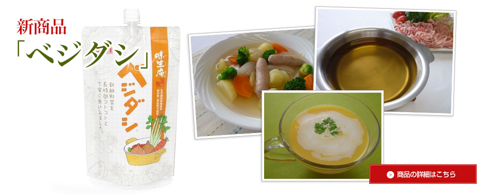 - “ベジ”とはベジタブル=野菜、“ダシ”=出汁(だし)という意味で、野菜を長時間煮込み抽出した“ダシ(出汁)”を使った調味料です。