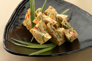 9.を巻き簾で形を整えて適当な大きさに切り、器に盛る。 |