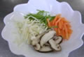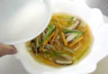 を入れて電子レンジで1分半加熱(730W)した後、すぐにスプーンでかき混ぜながら水溶き片栗粉を加えてとろみをつけ、野菜のあんを作る。