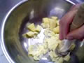 ボウルにじゃがいもを入れ、熱いうちに麺棒などで細かくつぶす。 |