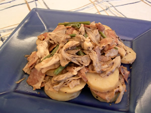 じゃがいもに火が通ったらまいたけ・さやいんげんを加えてさらに炒め、味生庵・牛乳・黒こしょうを加えてさらに炒める。 |