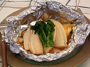 アルミホイルの中央に玉ねぎを敷いてサワラを盛り、マヨネーズをかけてたけのこ・エリンギ・パプリカを写真のように盛る。 |