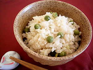 で豆ごはんを作りました。ほんのり色づいたごはんと豆の甘さがよく合います。ごはんを炊いている途中で豆を入れると豆がふっくら仕上がります。