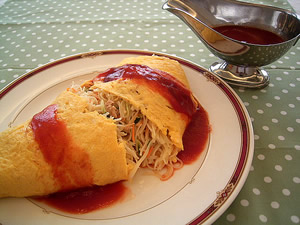 卵が半熟になったら真ん中に具材をのせて包み込み、火からおろす。 |