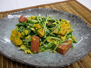 7.に水菜・スパムを加え、炒め合わせて火からおろす。 |
