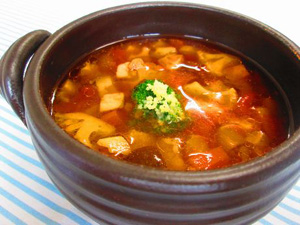 Cに味生庵・水・トマトを加えて煮込み、塩で味を調えて火からおろす。 |