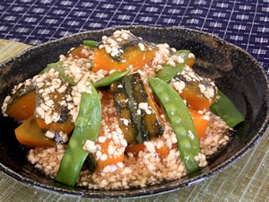器にかぼちゃを盛って上からあんをかけ、絹さやを飾る。 |