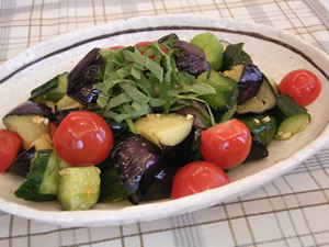 別のボウルになす・きゅうり・ミニトマト・たれの半分量を入れ、混ぜ合わせる。 |