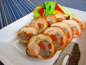鶏ももに人参・ごぼうをのせて巻き、 たこ糸できつめにしばる。 |
