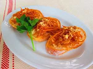 簡単にできる沖縄の家庭料理の人参しりしりをオープンサンドの具にしました。和風のおかずもパンにのせてバターやチーズをトッピングすると一味違ったおしゃれな朝食になります。