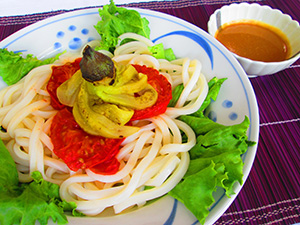 器にサラダ菜を敷いてうどんを盛り、中央部分にトマト・なすを順に盛る |